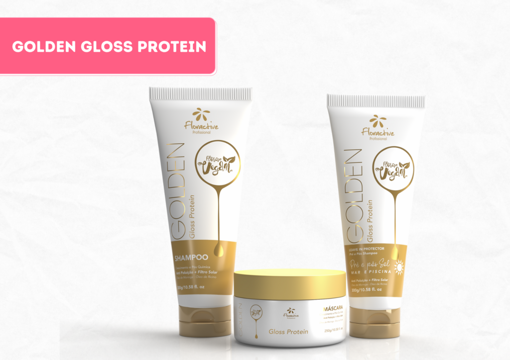 A linha Golden Gloss Protein é a ideal para fornecer nutrição ao cabelo quimicamente tratado. Por ser uma linha antipoluição, ela auxilia na penteabilidade. E por isso também, reduz a aderência de poluentes, além de promover uma manutenção do brilho após a exposição à poluição. Ela é composta pelo o shampoo, leave-in e máscara. Uma característica especial do Golden Gloss Protein, é que ele contém filtro solar. O leave-in pode ser usado como protetor térmico, combatendo o desbotamento dos cabelos com coloração.