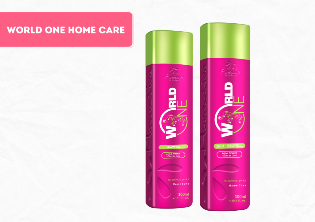 A linha World One é composta pelo o shampoo que higieniza os fios sem agredi-los, por conter uma formulação balanceada e eficiente, o efeito liso é prolongado e o cabelo se mantém hidratado e brilhante; e a linha também é composta pelo 3 em 1, portanto, ela reúne três principais cosméticos em um único produto: Condicionador, Máscara e Leave-in; esse diferencial da linha garante para os cabelos alisados, o efeito liso por muito mais tempo.